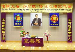 上午九点整,与会的大法弟子一齐发正念,然后由主持人为本次法会致开幕词,法会在庄严的气氛中开幕。共有二十六位新加坡同修上台宣读了一年来自己的修炼心得,点点滴滴中表现出了大法弟子修炼出的对师父对大法的正信和正念,其中有多位发言者都是流着泪水读完了自己的体会,场面感人。台下的与会者也一直给予掌声的鼓励,有很多时候台下的听众也在悄悄的抹眼泪,台上台下溶为一体,在大法中修炼出的慈悲和纯善感动着到场的每一个人。