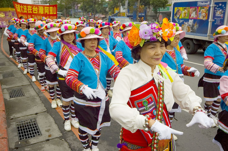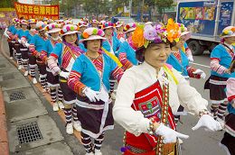 ![]() 在法轮功的游行中,这群身穿台湾阿里山原住民服饰,放着高山青的歌曲, 沿途跳着原住民舞蹈的阿公阿嬷总是这么健康有劲,吸引围观路人的眼光 |