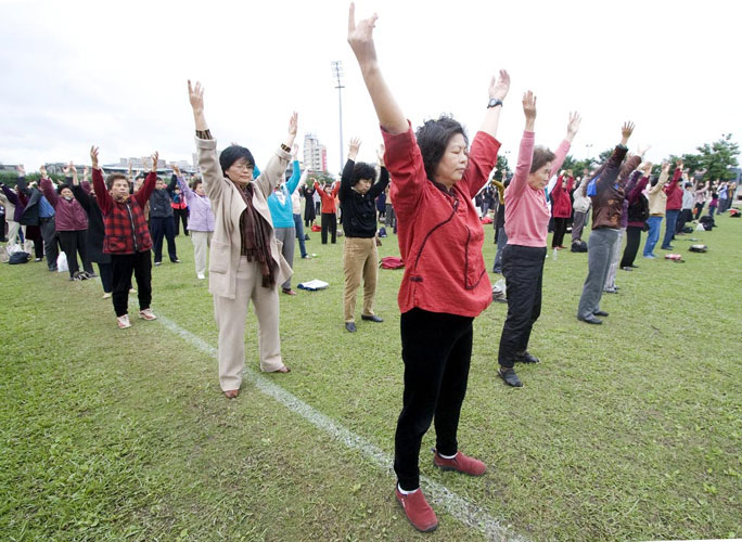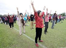 中午午休时间,大会另安排炼功活动,运动场的看台上几位民众好奇的观看,并学起了动作,法轮功学员热心向前教炼。