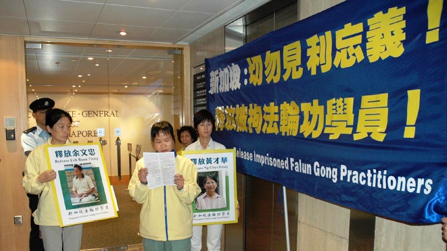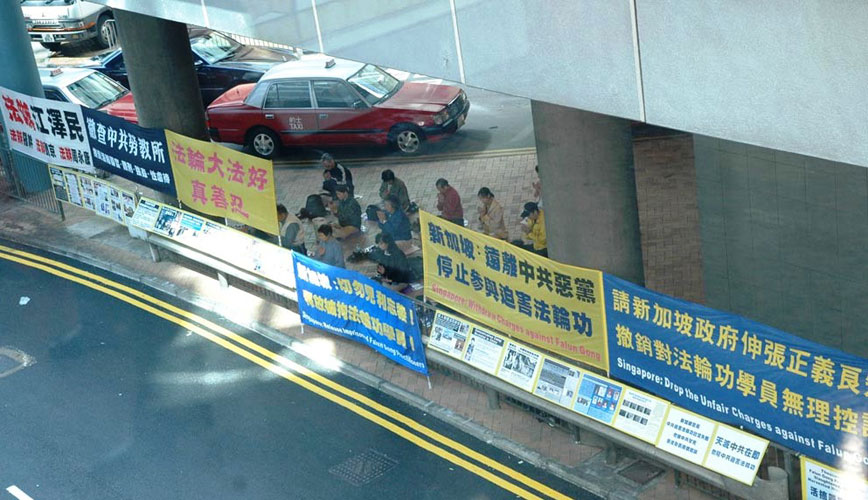 法轮功学员在新加坡驻香港总领事馆外张起横幅,呼吁新加坡当局勿做中共帮凶。