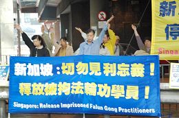 他们宣读致新加坡总领事的公开信指出,案件发生在今年七月二十日,三名新加坡学员在中共使馆外拉起横幅,要求中共当局停止迫害,后来新加坡警方将其中两人以所谓骚扰罪送上法庭。为了构陷他们入罪,法庭与有关当局配合,拒绝接受证实迫害真实性的联合国报告等文件作呈堂证物,又压制辩方提问,使用了种种手段匆匆结案,在上星期五宣判两名学员罪名成立,并强行将拒交罚金准备上诉的两人送进监狱。世界各地的法轮功学员都强烈谴责新加坡当局在中共的利诱下助纣为虐,做出无耻的判决。法轮功学员正告新加坡当局立即悬崖勒马,不要因为见利忘义而成为中共灭亡的陪葬品。