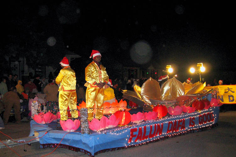 十二月初的艾达镇夜晚寒气袭人,但其一年一度的彩灯花车游行却吸引了两万多名热情的观众,并有福克斯电视台在现场转播。夜幕降临时分,天空烟花怒放,地上火树银花,一百多部彩灯闪烁的花车把艾达镇妆扮成一座不夜城。众多的团体和花车中,法轮功的队伍和花车与众不同,引人注目。高高架起的英文“法轮大法”字榜由两千多个彩灯排成,两面可看。“法轮大法”四个字在夜色中熠熠生辉,光彩夺目。