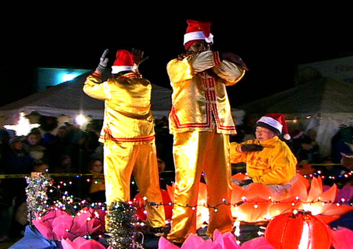 以“法莲处处开”为主题的花车上,一朵巨大的金色莲花和一朵较大的粉红色莲花在寒风中盛开。花心各有小弟子和老年弟子在打坐炼功。花车四周摆放着莲花灯和灯笼。两名西人弟子随着悦耳的音乐在炼功。花车后面是八位身着美丽中国传统服装的女学员舞蹈队,手摇粉扇,翩翩起舞。之后是由二十多人组成的腰鼓队,在高亢嘹亮的“法轮大法好”乐曲声中,精神抖擞,鼓点铿锵有力。所到之处,观众耳目一新,寒意顿消,精神为之振奋,有的竖起大拇指啧啧称赞,有的和着乐曲的节奏手舞足蹈起来。街道两旁有学员向观众散发真相资料。