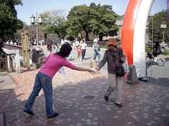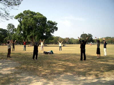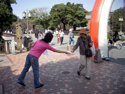 ![]() 在熊本城公园功法表演的学员 | ![]() 向游人发传单的学员 |