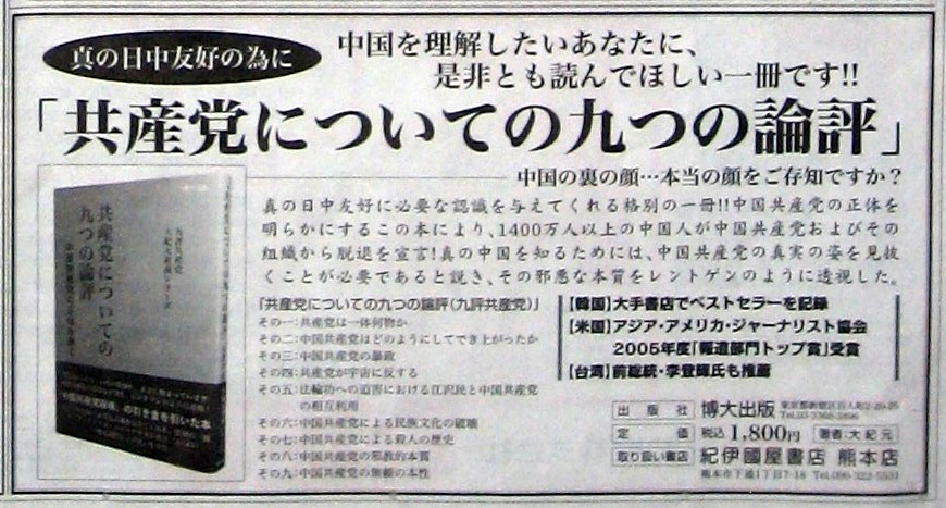 为了使世人容易理解和认识《九评》,熊本的法轮功学员们在拥有八百多万读者的日本最大的新闻媒体之一的“朝日新闻”登出了《九评共产党》日文版书籍的广告。本次广告的第一步以十月四日的熊本版开始,然后第二批是十月八日的九州版,全国版(分关东十一月十二日,关西为十一月十六日)《九评》的介绍先后与日本的八百多万读者见面了。其实,登出此广告的目地并不在于推销《九评共产党》的书籍,而是利用常人的广告形式向媒体讲真相,吸引广大读者来了解《九评共产党》,让所有的人都知道现在有一本让邪党惧怕的奇书在世界广泛流传,让日本人民也来了解邪党的真面目。而且,给海外的中国人提供接触此书的机会,以便看清中共邪恶本质,对中共邪党有一个正确的认识与判断,从而使他们能选择他们的未来。此次推广《九评共产党》广告和有关证实法活动是对大陆退党大潮的回应,尽可能的让全世界的人都来了解邪党,清除与解体邪党。