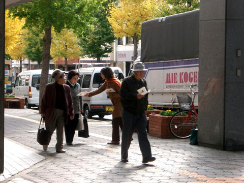 在宫崎,学员们做好活动准备刚要开始发传单,听到了介绍《九评》录音广播的一位中年男子走到学员跟前说道;“你们在宣传的叫《九评》的书在哪卖呢?我的感觉这本书肯定是好书。我要马上去买。”还有一位索取《九评》传单的老人跟我们说:“如此伟大的事情,该早做宣传。我支持你们,加油!”还有一位说:“比北朝鲜还邪恶的政党还要它干什么?邪的掰不过正的,自然会淘汰的。”民众的觉醒,使我们更加明白了师父讲的“‘九评’的背后是有神的因素”的法理的深层内涵了。我们的心到位,师父和众多正神会帮助我们,把众生安排到我们的身边来,让他们接触真相,了解真相,选择自己生命的未来。