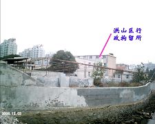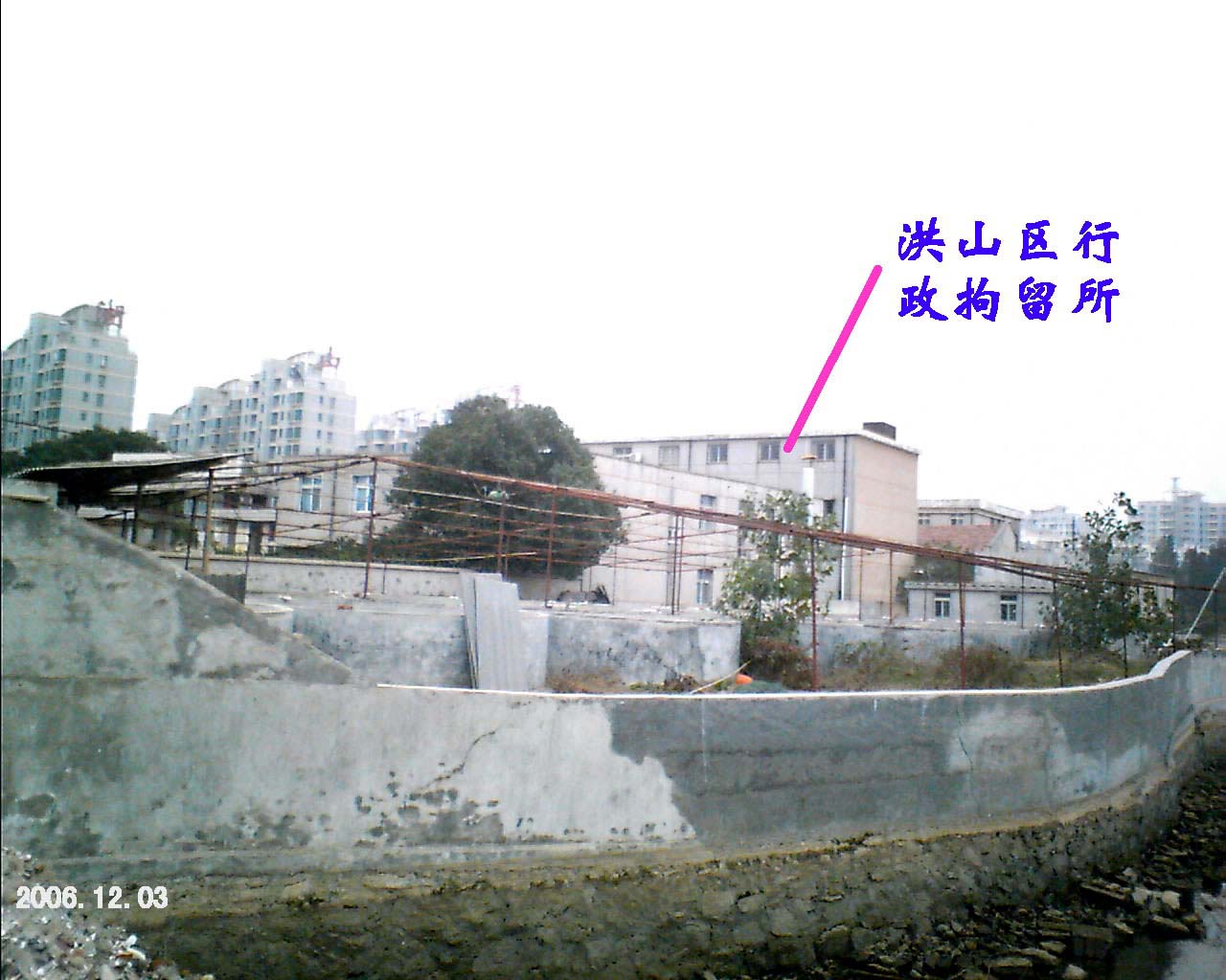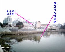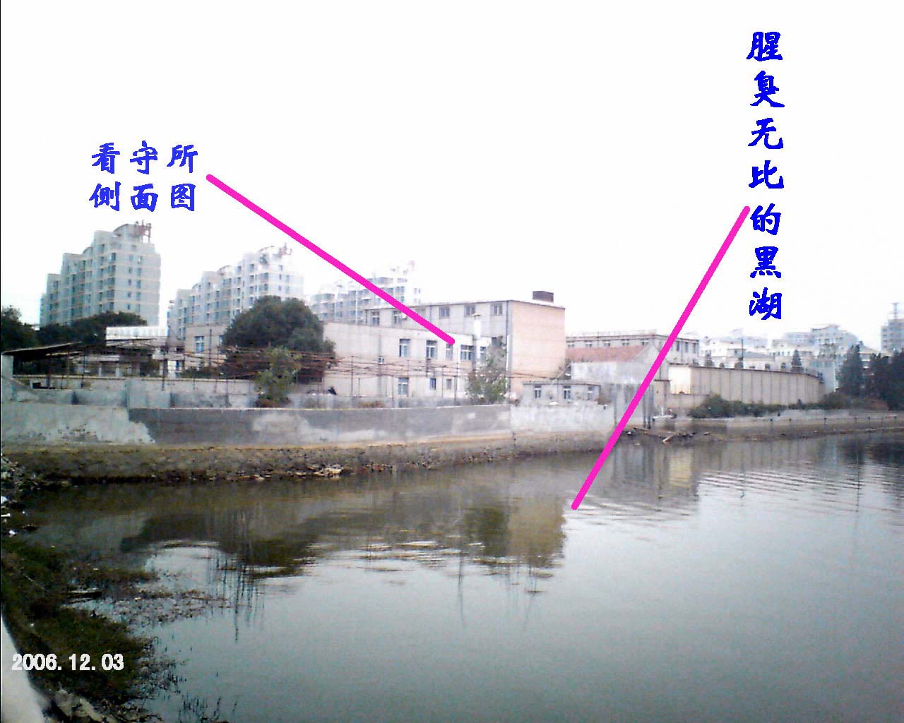 看守所的侧面和奇臭无比的南湖。由于七年来中共恶徒不遗余力的迫害法轮功,给当地造下了天大之罪业,湖水全部发臭,而且还是黑糊糊的,每年死鱼翻潭,行人掩鼻而过。