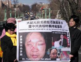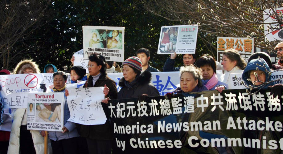 ![]() 华府法轮功学员和大纪元工作人员在中使馆前抗议 |