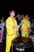 下午2点多,法轮功学员盛装来到警方提供的演示区,身着金黄色炼功服的学员时而演示法轮功功法、时而表演民间腰鼓,鼓声阵阵吸引了很多人的关注。还有的女学员身着七彩仙女服表演舞蹈,小弟子也参与其中。学员在栏杆上挂上各种横幅,介绍法轮功,谴责中共的迫害,并呼吁制止中共把对法轮功的迫害延伸至海外。