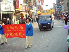 深受苗栗民众欢迎的“法轮大法神威腰鼓队”的庞大阵容展现在队伍中。他们精神抖擞,动作整齐,让两旁的观众看的聚精会神,由于在队伍最后压阵,后面又有警车跟随,震撼之余,更显得与众不同。