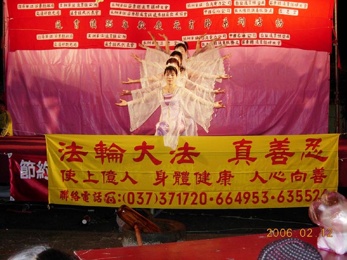 苗栗通霄庆祝“小过年”元宵节晚会,于2月12日晚间7时30分在通霄慈惠宫前广场举行,吸引大批镇民涌入会场共襄盛举。晚会由巫恒昭镇长及慈惠宫主委揭开序幕,所有节目都是由各社区协会所提供,唯有两队是主办单位特别邀请,分别是头份镇法轮功学员组成的仙女队及大纪元时报义工表演的行动剧。