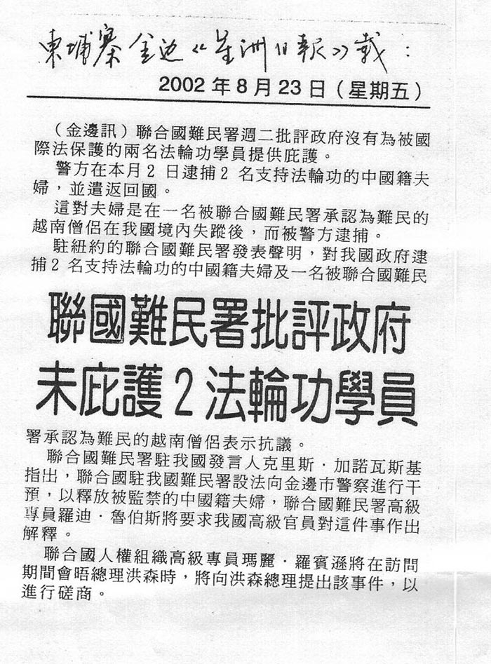 因修炼法轮功,坚持自己的信仰,向民众讲真相,张新义女士已不止一次遭受来自中共的迫害。2002年8月,正在柬埔寨金边崇正中文学校任教的张女士及其丈夫李国军先生突然遭柬移民局逮捕,其后便被强行遣送回国,柬方人员明确告知张女士及丈夫他们是受中共驻柬大使馆指使。当时,张女士夫妇已向联合国难民署驻金边办事机构申请庇护获准,是受国际法保护的难民。张女士与丈夫遭柬埔寨当局逮捕并遣返事件当时受到各方关注,金边《星洲日报》2002年8月23日曾以“联合国难民署批评政府未庇护2法轮功学员”为题报道此事(见附件)。回国后,张新义及丈夫又被当地警方非法关押了一个月,才在国际组织的营救下获释。