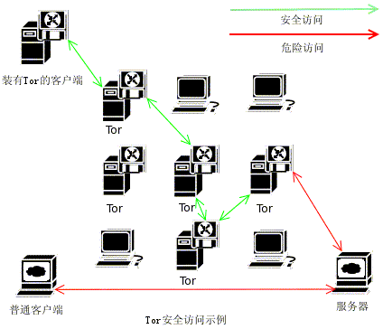下图是一个简单的Tor安全访问与危险访问的区别示意图: