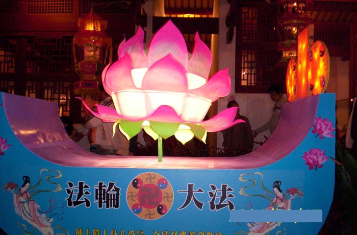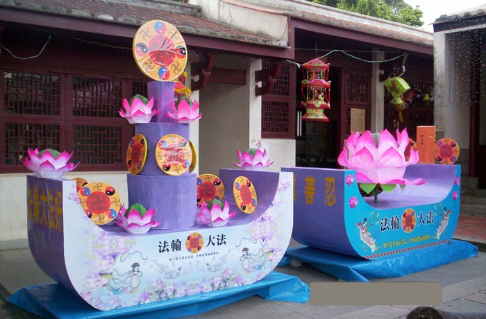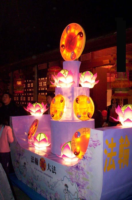 在一片“好运旺旺来”、“福旺财旺旺”、“飞狗一跃迎新春”等狗造型花灯下,由金门法轮功学员参展的法船花灯,显得格外的凸出与亮眼。