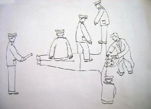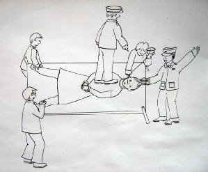 大法弟子绝食,七八个警察和恶狱医共同迫害大法弟子,在地上野蛮灌食。有两个恶警把大法弟子胳膊拉开踩住大法弟子的两手,并且用穿皮鞋的脚捻手;有一个恶警用一只脚往大法弟子的胸口及肚子跺;一个恶警坐在大法弟子腿上;还有的恶警拿着电棍。恶狱医则蹲在地上快速用小勺灌食,也根本不管大法弟子能否喘上气来,倒的满头满脸全是灌食的苞米糊,苞米糊不知兑的什么。