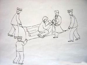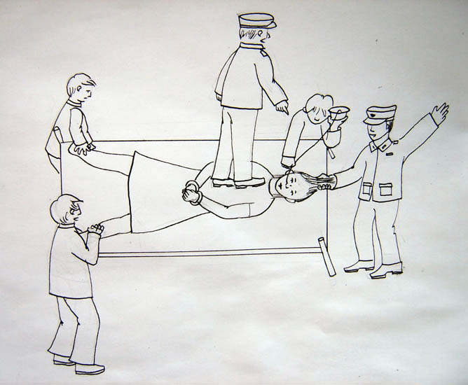 用杀人犯看着大法弟子,把大法弟子手脚绑在铁床上,绑得太紧不通血脉。床上只有身上一块带窟窿以方便大小便的木板。大法弟子绝食,给大法弟子灌苞米糊,不知里面掺了什么,大法弟子上吐下泻。用杀人犯当“医生”,往大法弟子身上输毒药6瓶,共输了6天6夜。往大法弟子打毒药,还扣大法弟子帐上的钱。浑身发冷,就象掉就冰窟窿一样。又抽血,抽不着就往骨头上扎,扎得直有声响。心电图已经显示不出心跳,跟死人一样。有的警察和犯人眼里都含着眼泪。大小便根本没有人管。有的大法弟子被绑在死人床上迫害20天,有的弟子甚至被绑在死人床上达几个月。没有师父加持,死人床根本下不来。