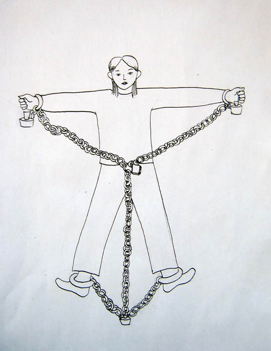 脖子上戴着铁环,两手腕上戴着手铐,两脚踝上戴着死刑犯脚镣,又用铁链把这三部份串起来,人的身体只能向前倾,佝偻着。锁头是在连结手和脚之间的铁链上。地环是永久固定在脚前面的铁块上。铁块嵌在犯人集体大床上。
