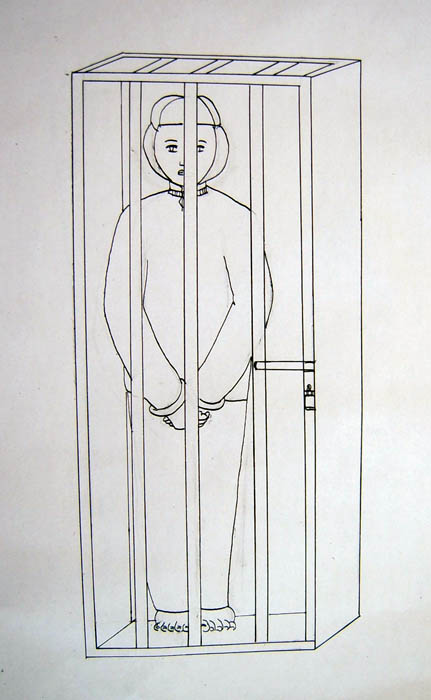 身后已没有空隙,然后再放一块上面有很多刺的木板。人经过这样一折腾,站在木板前只能踮着脚尖,难受程度可想而知。脚上也戴着手铐,勒上一宿,脚和腿便肿得很厉害,只有脚踝骨处很细,踝骨看的很清楚,因是被手铐勒的。