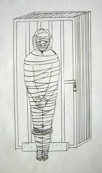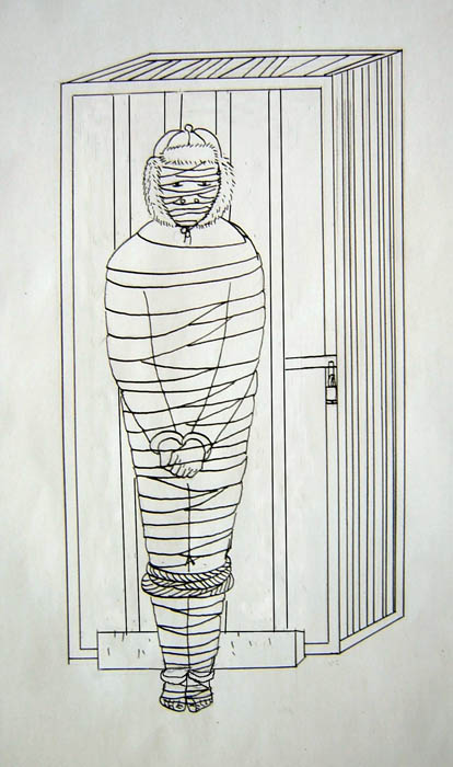 把大法弟子先戴上手铐和脚镣,再浑身缠上塑料,包括头,只留两眼和鼻孔几处窟窿。头上缠完塑料后又用棉帽戴上,捂得很紧。在膝盖下方用绳子缠上,后面缠在小笼子上,勒的很痛。