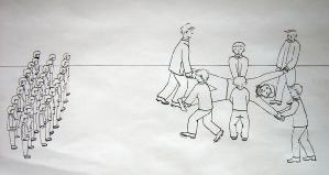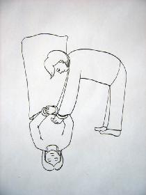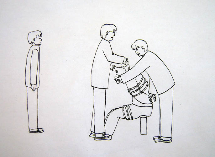 大法弟子不转化,把大法弟子和一个犯人投入小号,分别用手铐铐上,两人手铐交叉铐着。犯人睡觉,不许大法弟子睡觉,只能九十度哈着腰。