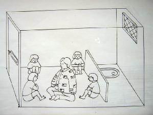 在一个小号内,四个犯人包夹一个大法弟子,身后用一块板挡着,就是便厕。夏天强迫大法弟子穿上棉袄,为怕大法弟子脱下棉袄,棉袄对襟用机器扎上,手撕不开。因大法弟子不戴监狱管理犯人的小牌,在棉袄上缝上很多犯人小牌。大法弟子手一动,包夹犯人便上来拳打脚踢。犯人还踩大法弟子的脚踝。有的大法弟子穿着棉袄六天六夜被逼不让睡觉。