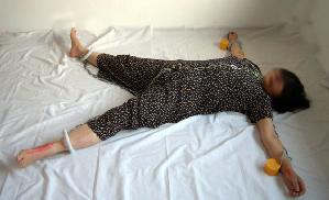 手和脚用手铐铐上,小臂和小腿全部用黄胶带缠在床的三角铁架子上,以此来达到转化大法弟子的目的。