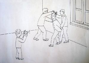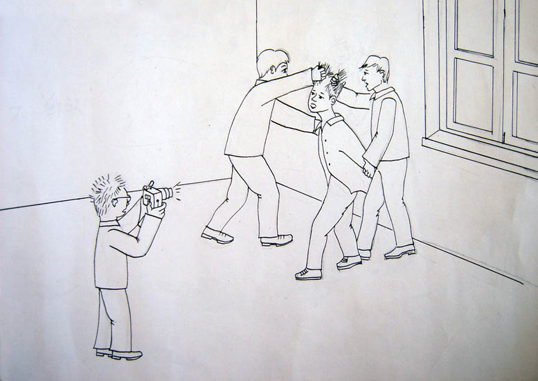 大连公安一处到姚家看守所提审大法弟子,大法弟子拒绝回答问题,并且劝善。他们达不到目的,趁着送大法弟子回监室的瞬间,为了达到照相的目的,几个便衣警察互相一使眼色,四五个警察马上对大法弟子拳打脚踢,把大法弟子摁在墙上,不管年纪多大。有的揪头发,有的捂嘴,有的踢腿,有的把手等。照相的便衣恶警趁机照相。