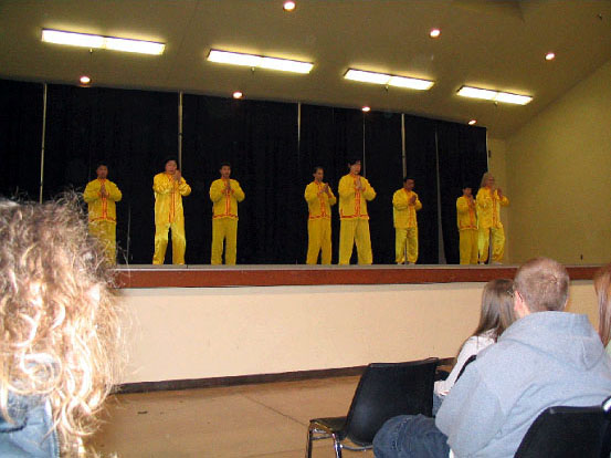 法轮功学员们也再度借此机会向更多的人们展示大法的美好并揭露中共六年多来残酷迫害法轮功修炼者的真相。伴随着优美的音乐和解说,学员们为观众表演了五套功法,并在摊位上向游客讲真相。