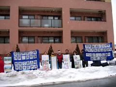 2月17日下午开始连续三天,大家在札幌中领馆前打出横幅、看板,冒着严寒在风雪中静静的站立、炼功、发正念,進行24小时接力绝食,用和平、非暴力的行动表达自己的心声。一位十几岁的小姑娘也和妈妈一起来到札幌中领馆,严寒中她和大家一样坚持到晚上。当学员向警察讲述真相看板的时候,警察指着李渊被袭击后的图片说,你们就是为了这个,坐十几个小时的船来北海道的吗?学员就详细的给他讲法轮功真相,并把各种资料发给他们看。一位学员还把一本日文版《法轮功》赠送给警察,希望他们能了解法轮功,理解为什么世界上有一亿人在修炼法轮功而且身心受益,并告诉他们,在中国法轮功却无辜遭受打压,现在中共又把这种暴政、残酷的迫害延伸到海外。