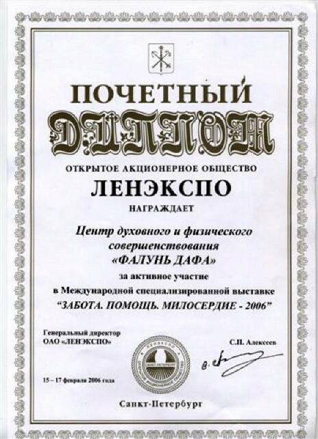 【明慧网2006年2月28日】2006年2月15—18日,在俄罗斯圣彼得堡国际展览中心,举办了为期三天的国际健康博览会。这次博览会的题目是:“关怀、帮助、慈善”,目地是利用这样一个机会,促進社会方方面面都来关心帮助老年人和残疾人。圣彼得堡的法轮功学员应邀参加了博览会。并举行了两场法轮大法介绍及五套功法演示。受到主办单位的好评和观众的热烈反响。