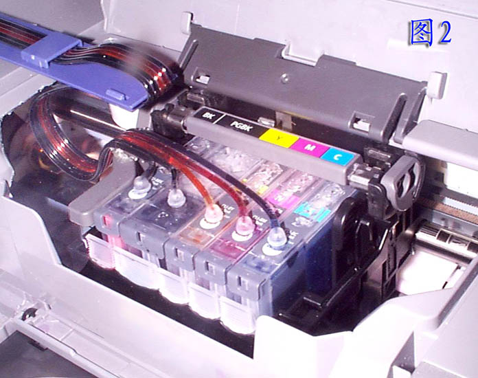 国内彩喷连供的开发商的对打印机改连供的原则是,不改动打印机,越简单越好,一是方便用户独立安装,再也是为了保留一年期的保修资格。电子书是把打印机的机壳用锯条锯掉,其实不用那么麻烦,可以从电脑城卖连供处购买外置“平衡墨盒”和“硅胶排管”及“管线支架”和管线连接墨盒用的“小弯头”,有的商家有外置平衡墨盒和硅胶排管还有小弯头已经粘接好的(50元左右),当地买不到也可以查找连供厂商邮购。现在有的连供厂商也是推荐使用这种用原装墨盒改连供的方法(如图1)。