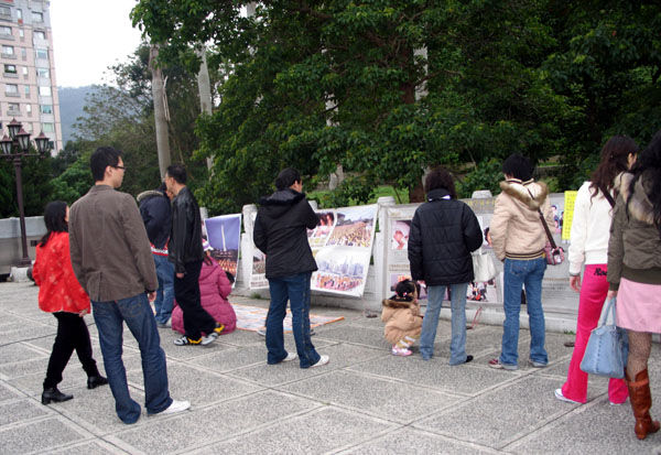 ![]() 大年初四的故宫──法轮功学员炼功 | ![]() 大陆观光客认真的看着真相展板 |