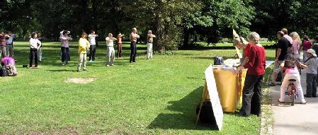 在德国南部城市Ulm一个公园里炼功,传播法轮功受迫害真相