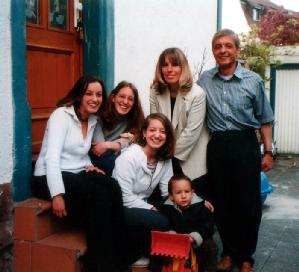 海德堡“法轮大法之家”。左到右,二女儿史黛芬妮(stefanie ),大女儿卡罗琳娜(caroline),三女儿约翰娜(johanna),母亲爱蒂特(edith),父亲胡伯特(hubert),前面是小儿子约书亚(joshua)