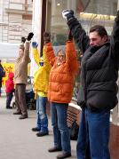2006年2月3 日,中共外交部长李肇星与欧洲三驾马车外交部长在奥地利维也纳会谈期间,法轮功学员举行了和平抗议活动,抗议中共对法轮功学员将近7年的残酷迫害。