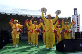 星期六,法轮功学员不断的在展位示范功法,并表演舞蹈,吸引了大批的观众。有的观众有兴趣进一步了解和学炼法轮功。