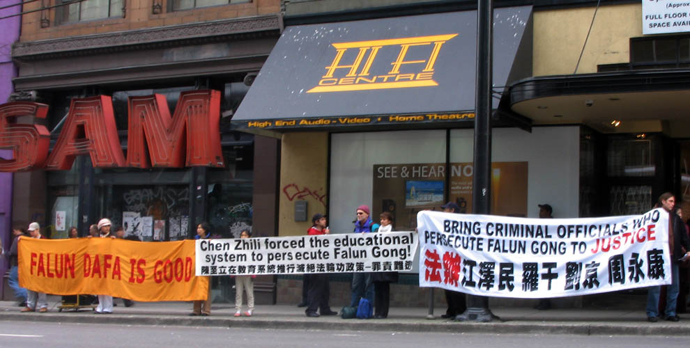 陈至立在7日参加不列颠哥伦比亚理工大学(BCIT)的孔子学院开业典礼期间,法轮功学员打着“停止迫害法轮功”,“陈至立在教育系统推行灭绝法轮功政策──罪责难逃!”等横幅在场抗议。