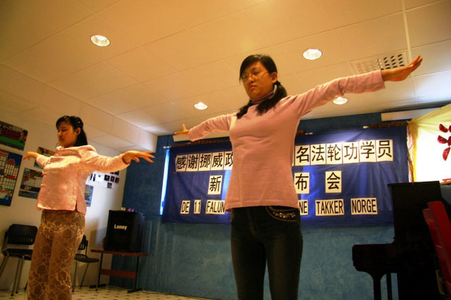 发布会首先由Terese代表11位法轮功学员宣读了一封致挪威政府和人民的感谢信。感谢他们给予遭受中共残酷迫害的法轮功学员的无私帮助。在祥和优美的炼功音乐声中,由2名学员演示了法轮功五套功法。然后由4个家庭的11名学员分别向与会者详细讲述了自己的修炼经历,法轮功带给人的美好以及在中国遭受的残酷迫害。
