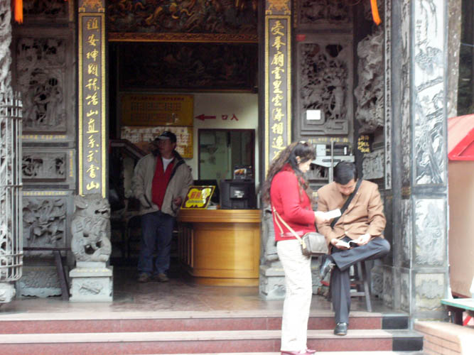 两位大陆观光客拿着大法资料在受镇宫的飞檐下慢慢阅读