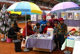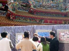 开始展出前几天,眼看一批批游客站在受镇宫前忙着看风景、拍照,只有几个人走进展场来,学员赶忙发送资料、引导进场观赏,可是也没有很大的效果;后来有人出了主意,搬来了希望树,请游客说一句好话就送一朵纸莲花,果然吸引很多游客进来观赏照片,于是一批摺莲花的学员也上山来了。