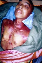 黑龙江省44岁的法轮功学员王斌于2000年9月24日被大庆男子劳教所恶警冯喜等毒打致死。被打死后内脏被野蛮摘除,遗体被放在大庆人民医院太平间里,心脏、大脑被剖出。图为王斌伤痕累累的遗体。