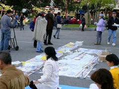 许多过往路人被祥和的功法所吸引而驻足观看,有人还尝试学炼。讲真相的海报和横幅吸引了不同年龄的人们。人们仔细的听取学员善意的讲述中共对法轮功学员迫害之恐怖。