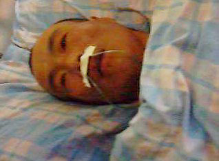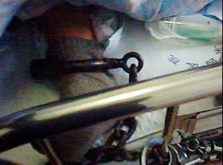 上图:2004年11月,程佩明被大庆监狱迫害得生命垂危,尽管人已经非常虚弱,脚仍被铐在病床上。