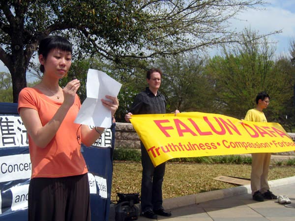 原德州大学学生,现已是美国公民的王晓丹集会时已经绝食数小时。她向民众讲述了她修炼法轮功的父亲王治文六年前被中共恶党非法判16年,并在狱中遭受非人迫害,至今她未能与父亲说过一句话。中共在苏家屯的恶行使她十分担心父亲的处境,她呼吁世人给予援助。
