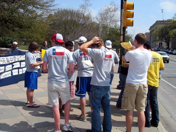【明慧网2006年3月13日】知情人士最近披露的中共在沈阳苏家屯集中营屠杀法轮大法弟子,并盗取器官获利。其丧尽天伦,举世震惊;其罪恶之深,人神共愤。2006年3月11日,美国德克萨斯州圣安东尼奥的法轮功学员和奥斯汀学员聚集在州政府及议会大厦,宣布绝食强烈抗议中共恶行,声援中国国内的同修。