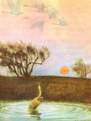 对于他过去所受的不幸和苦恼,他现在感到非常高兴。他现在清楚地认识到幸福和美正在向他招手。——许多大天鹅在他周围游泳,用嘴来亲他。