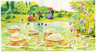 花园里来了几个小孩子。他们向水上抛来许多面包片和麦粒。最小的那个孩子喊道: