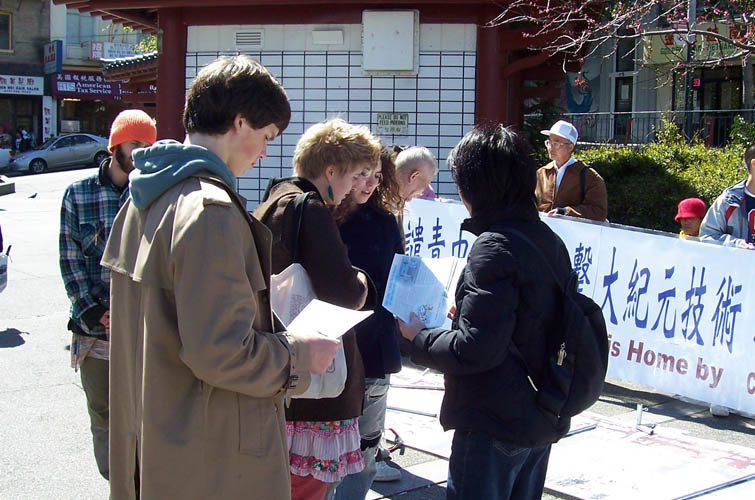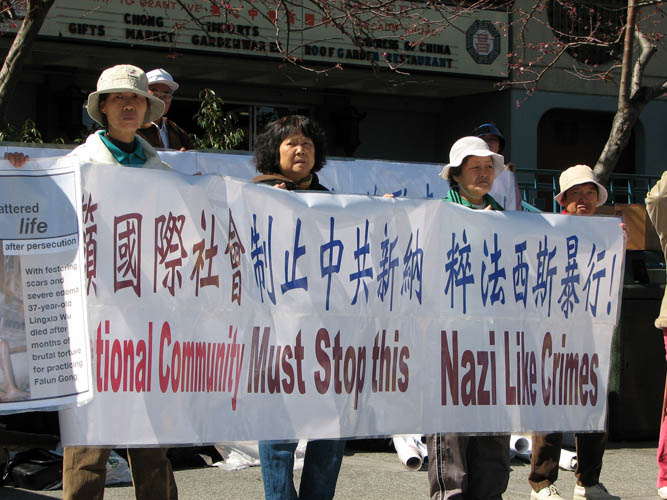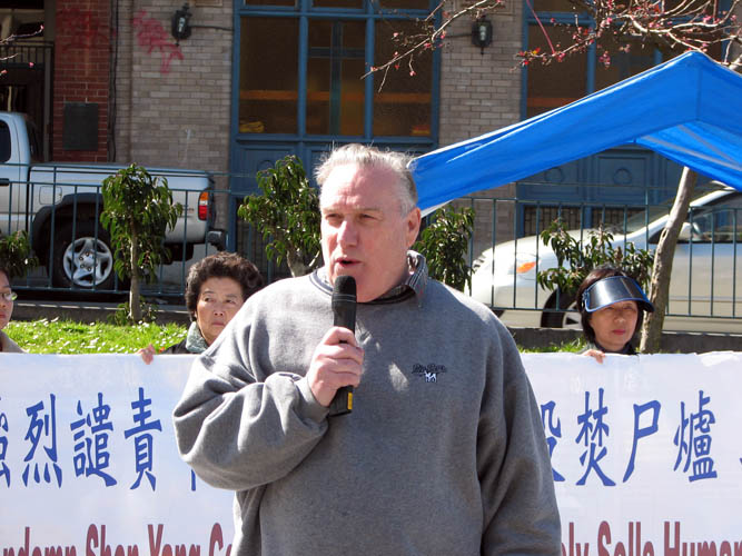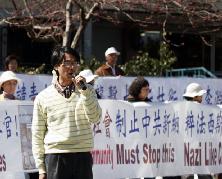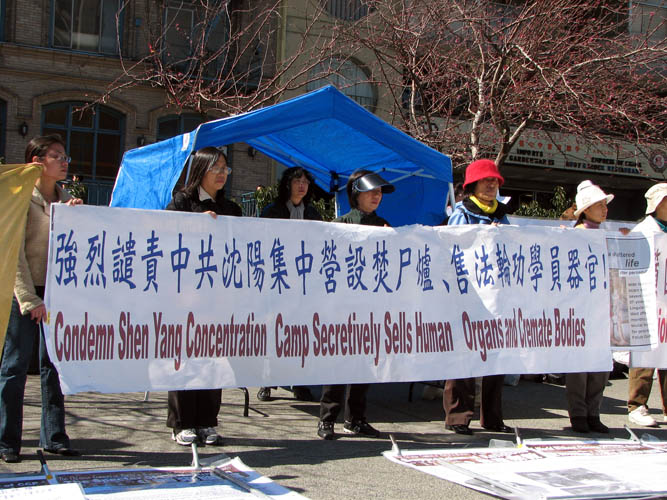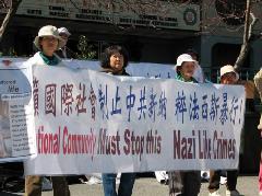 【明慧网2006年3月13日】(明慧记者黄凯莉、王英旧金山报导)中共沈阳苏家屯集中营拘禁至少6千法轮功学员、摘除他们的器官,并焚尸灭口的消息传出后,令各界震惊。2006年3月11日中午,旧金山各界团体在中国城花园角集会,强烈抗议中共纳粹法西斯灭绝罪行,并呼吁紧急营救在中国受迫害的法轮功学员。