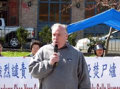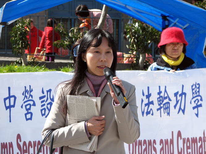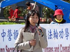 湾区法轮功学员程铭华在集会上陈述了多起经调查证实的,中共使用酷刑迫害虐杀法轮功学员,并摘除他们的器官的案例。她说,中共在沈阳集中营设焚尸炉,出售法轮功学员器官的报导刊登后,许多善良的人不敢相信,这灭绝人性的恶行就发生在我们的身边。江泽民早在99年就下令对法轮功学员打死白打死,不查身份,直接火化。她希望大家都阅读《九评》,了解中共嗜血杀人的真实面目。