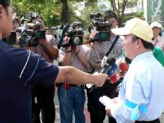 ![]() 在现场sos等紧急求救及谴责中共暴行的看板林立,令人动容。 | ![]() 中共恐怖暴行天理不容,各大媒体在现场访问小儿科医师聂淑文 |